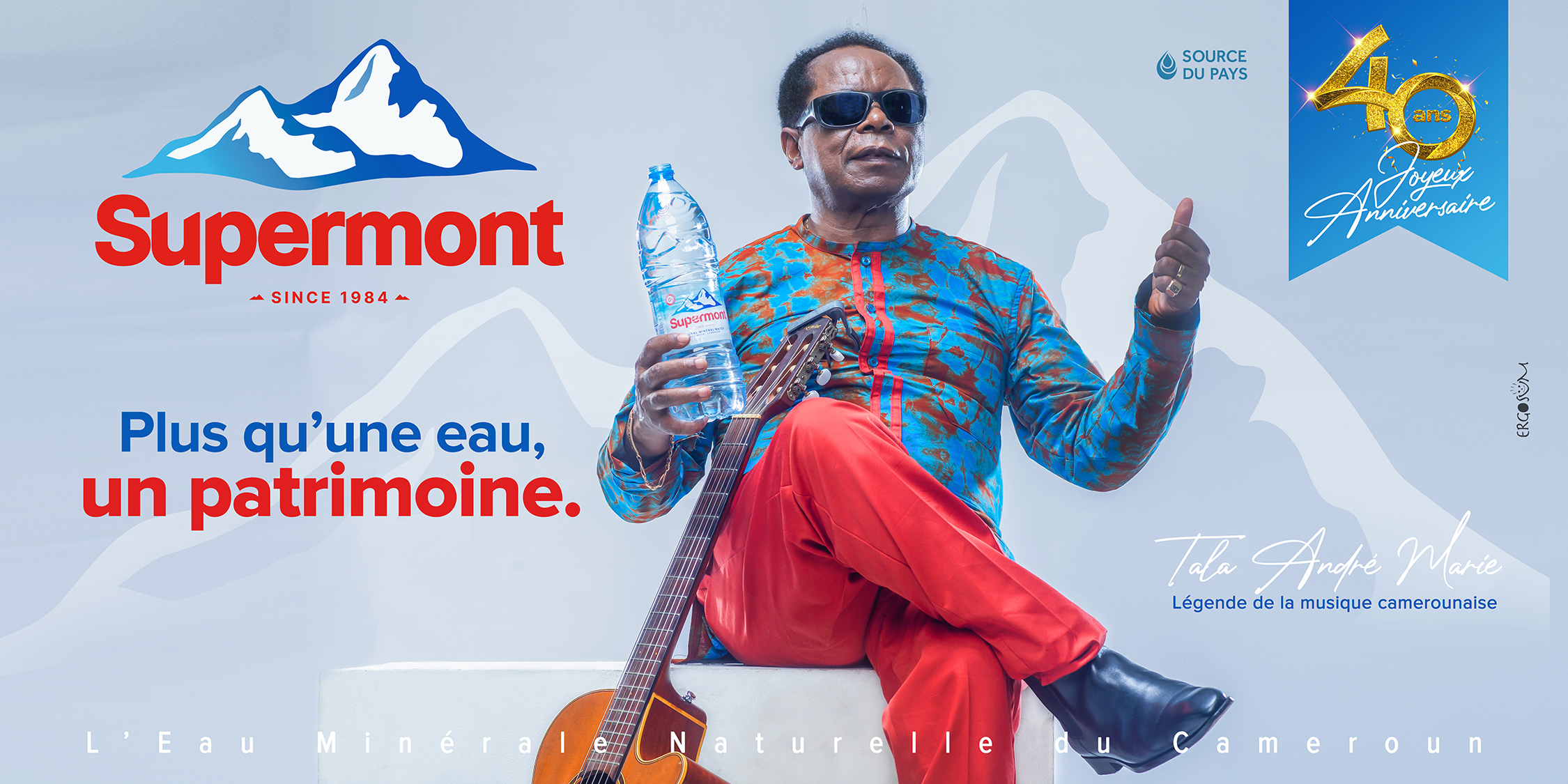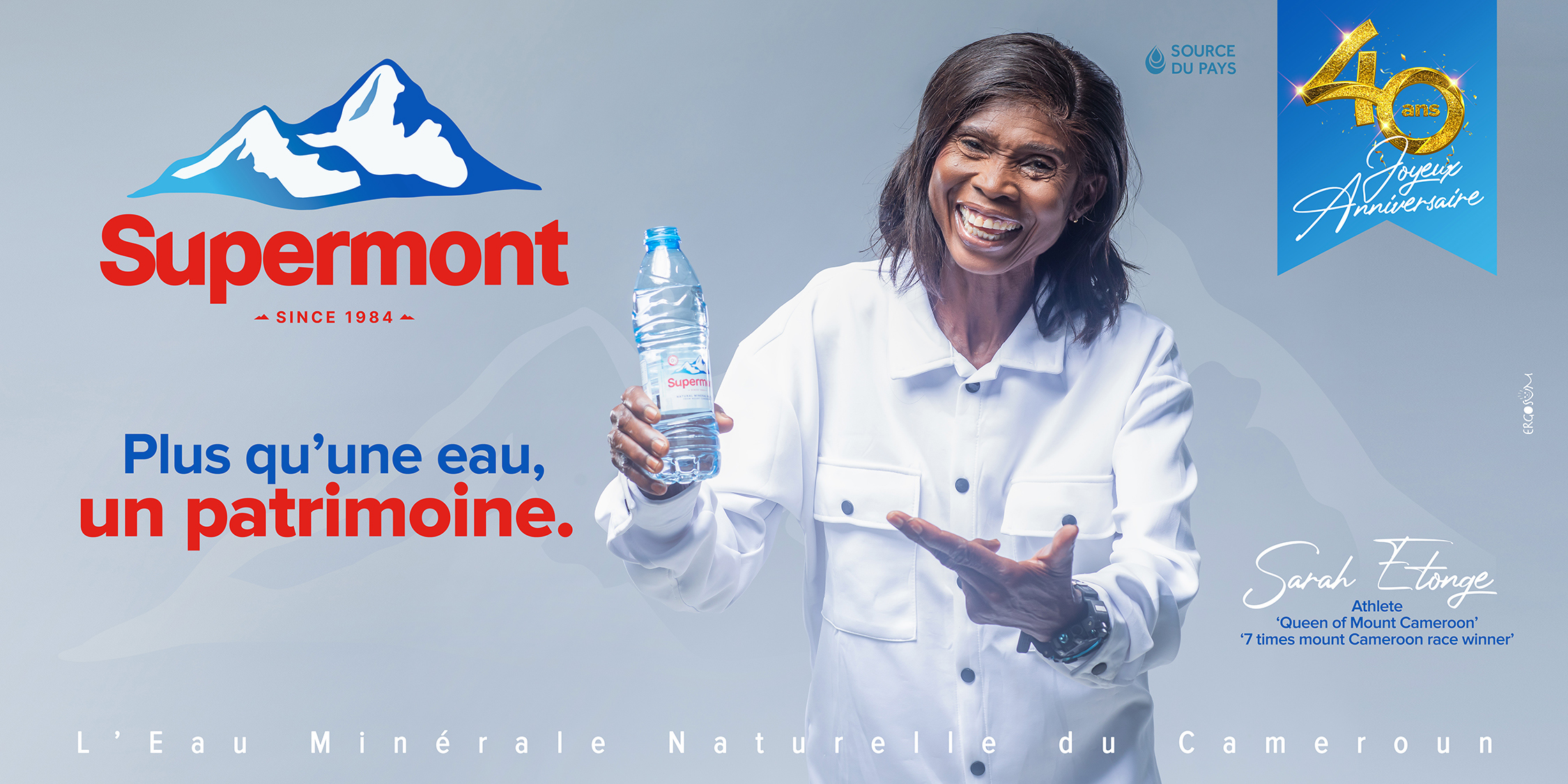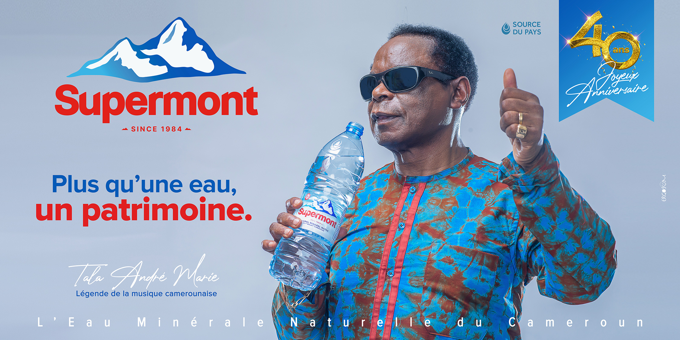 L’eau minérale naturelle du Cameroun Supermont est aujourd’hui érigée au rend de "patrimoine" national ; et qui de mieux que ces 3 géants de notre pays pour représenter et porter ce mot tellement charger en background émotionnel : Petit Pays - Tala André Marie - Sarah Etongè. on ne les présente plus, vous savez qui ils sont et ce qu’ils ont accomplis dans leurs différents domaines.