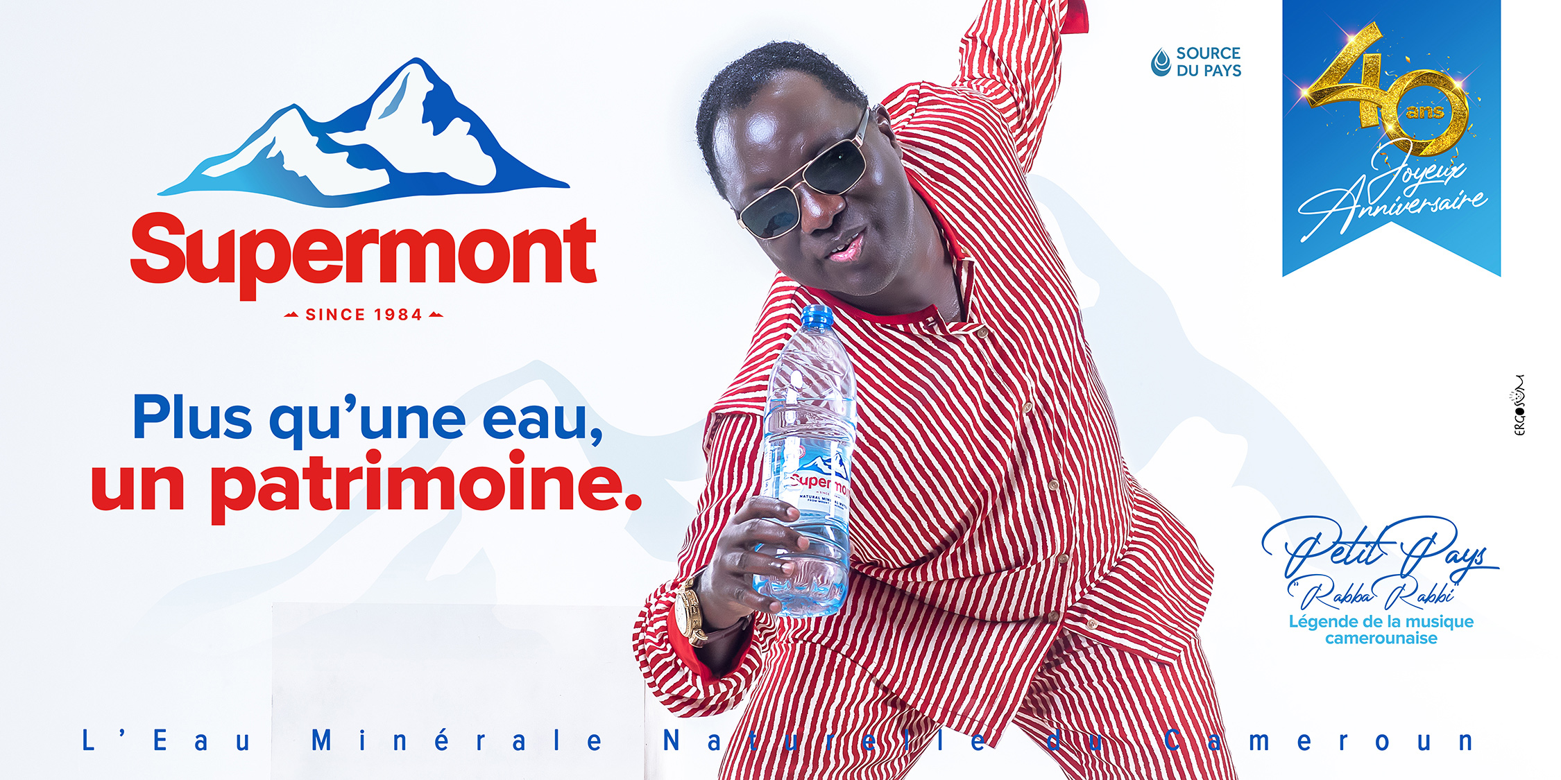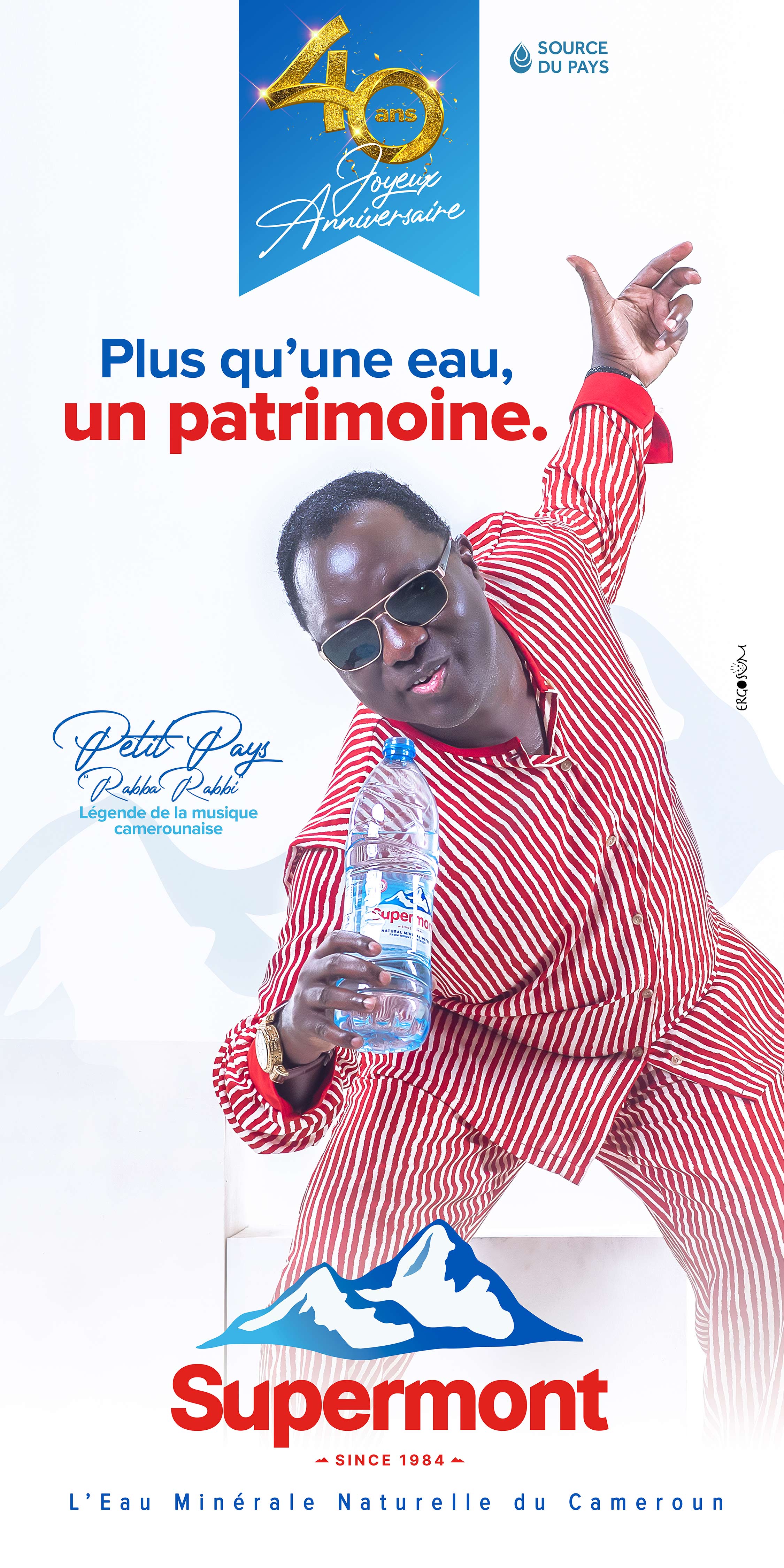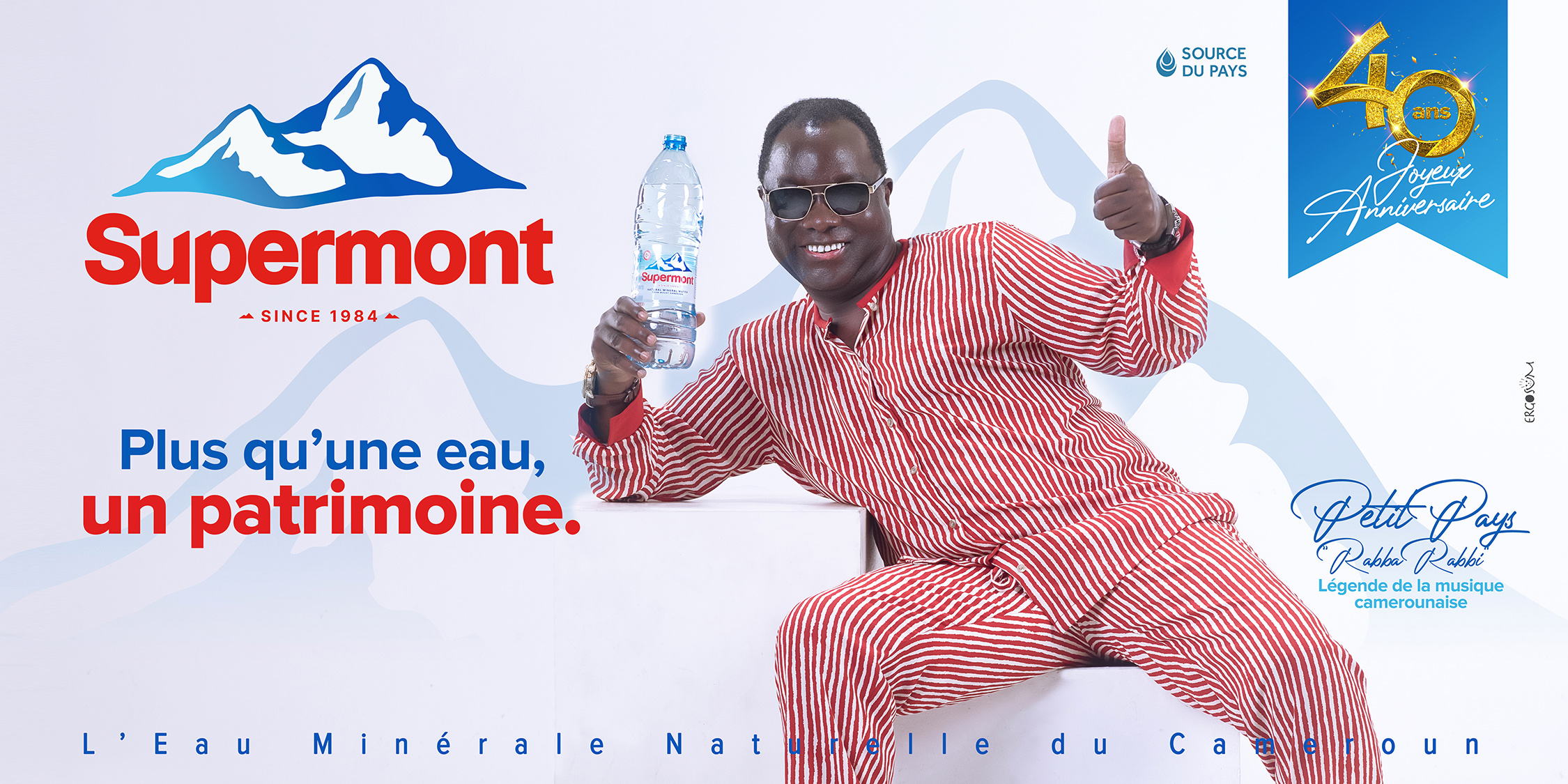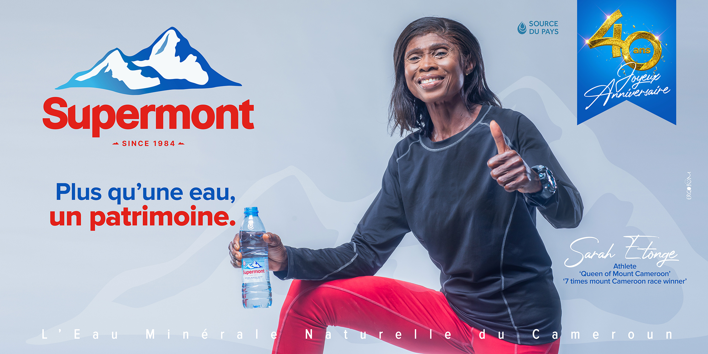 L’eau minérale naturelle du Cameroun Supermont est aujourd’hui érigée au rend de "patrimoine" national ; et qui de mieux que ces 3 géants de notre pays pour représenter et porter ce mot tellement charger en background émotionnel : Petit Pays - Tala André Marie - Sarah Etongè. on ne les présente plus, vous savez qui ils sont et ce qu’ils ont accomplis dans leurs différents domaines.